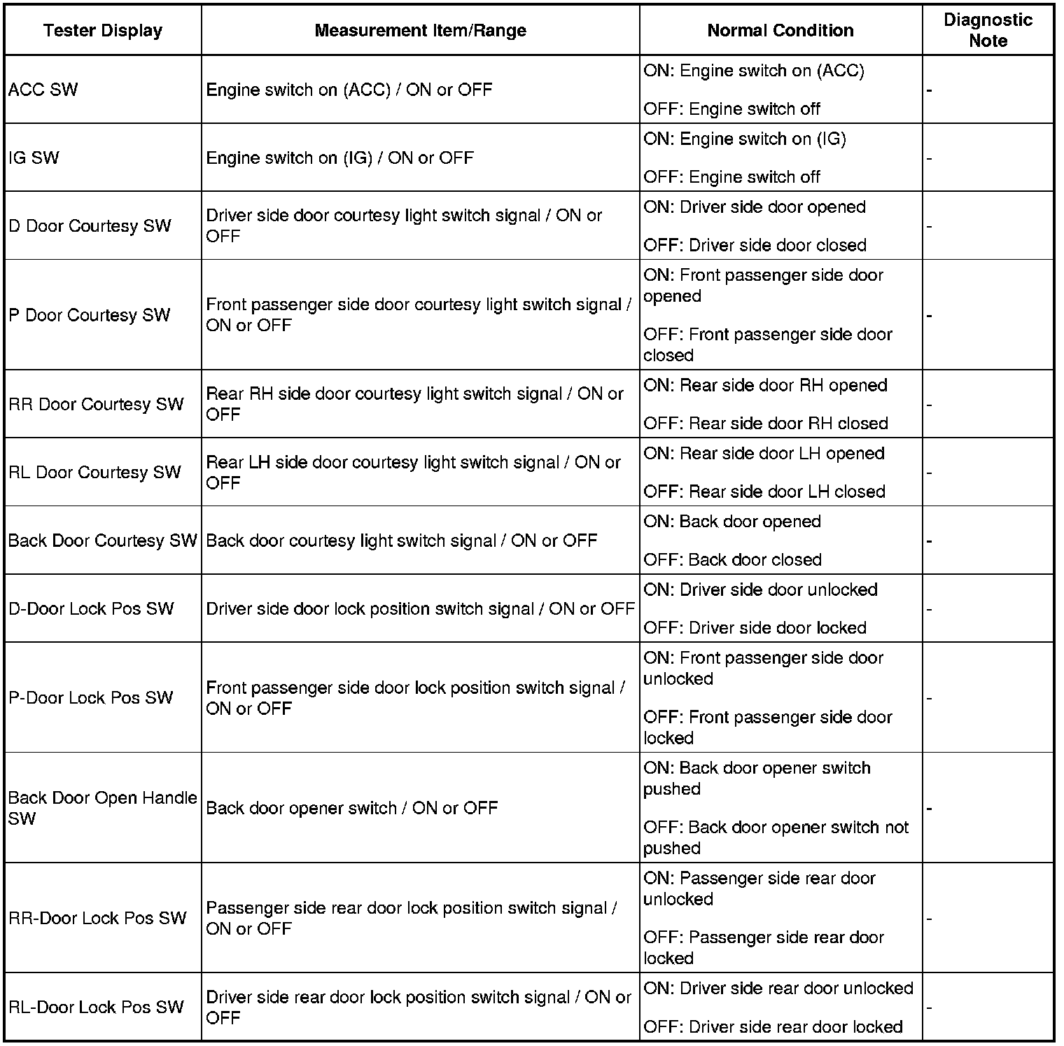 HINT: Using the Techstream to read the Data List allows the values or states of switches, sensors, actuators and other items to be read without removing any parts. This non-intrusive inspection can be very useful because intermittent conditions or signals may be discovered before parts or wiring is disturbed. Reading the Data List information early in troubleshooting is one way to save diagnostic time.