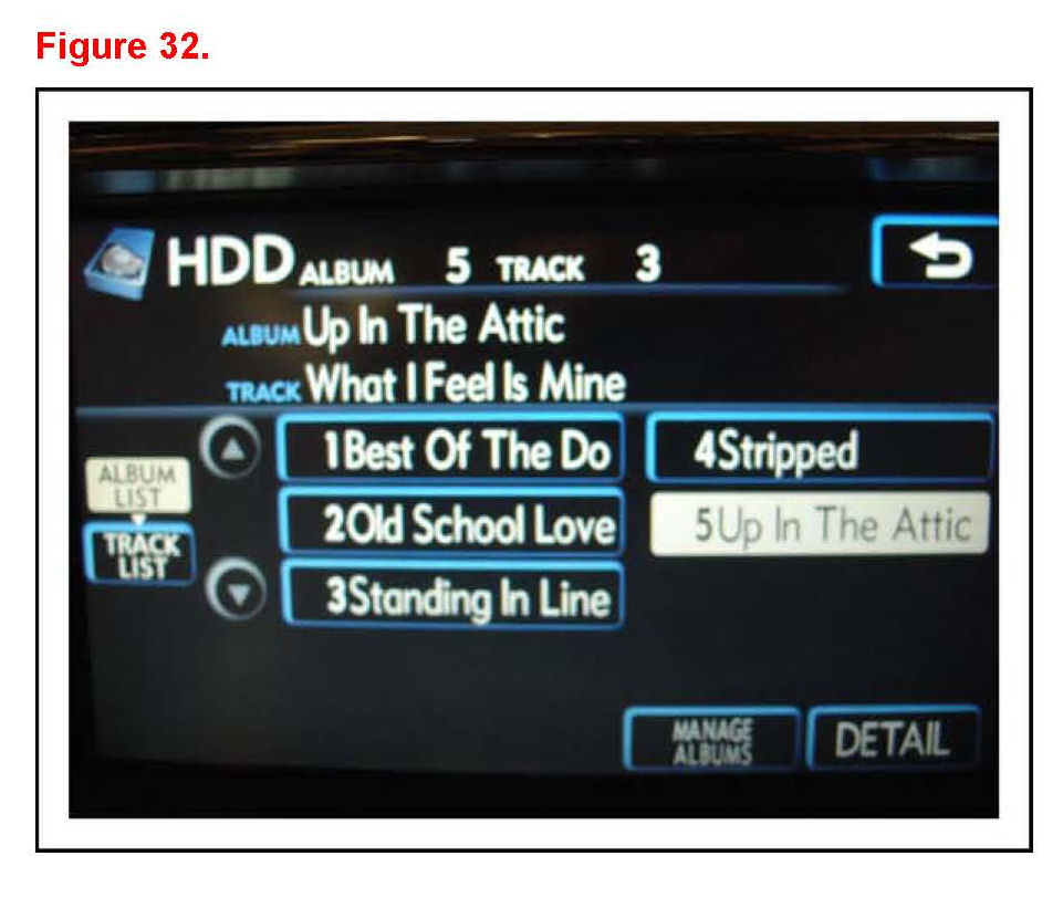 Lexus models equipped with a Hard Disk Drive (HDD) Navigation System contain a jukebox feature that allows up to 2000 audio recordings to be transferred from their original CD media to the HDD on-board the vehicle. Detailed information about the audio recordings is attached to each track at the time of transfer. When each audio track is presented on the touch screen informational details including Genre Artist Album and Title are presented. This detailed track information is stored on the HDD in the Compact Disc Database or CDDB.