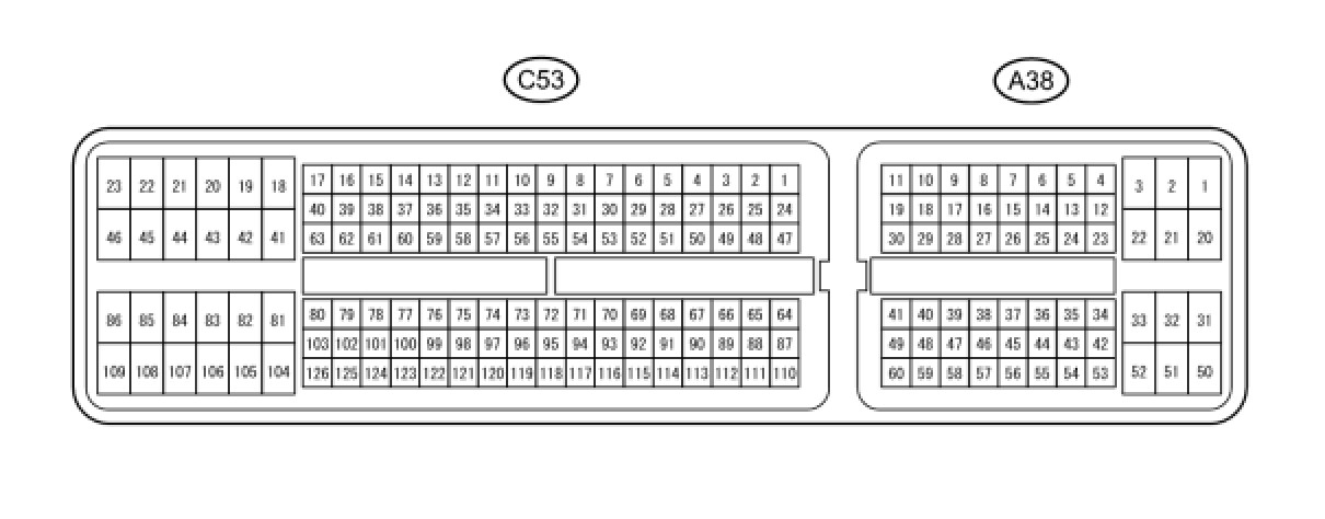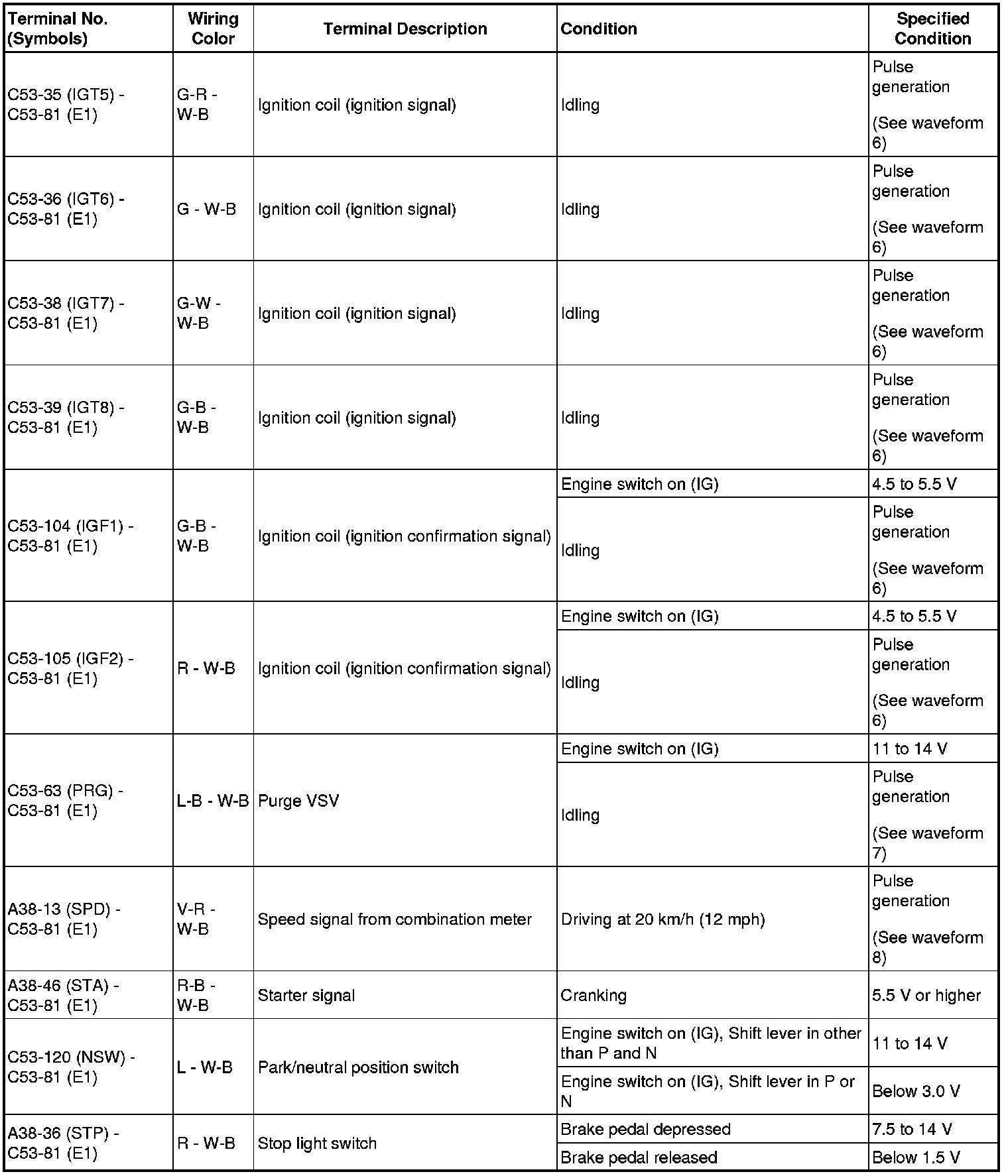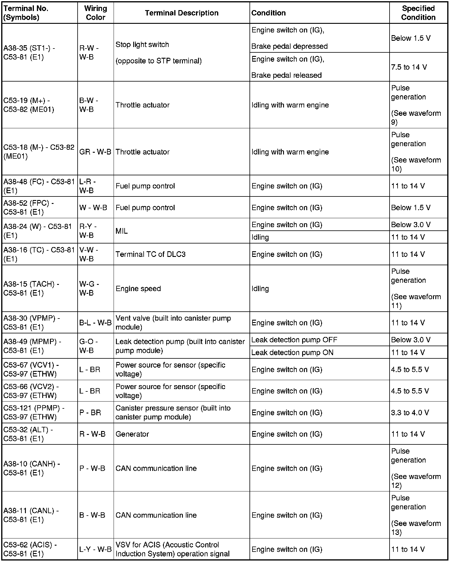 HINT: The standard normal voltage between each pair of ECM terminals is shown in the table below. The appropriate conditions for checking each pair of terminals are also indicated. The result of checks should be compared with the standard normal voltage for that pair of terminals, displayed in the Specified Condition column. The illustration above can be used as a reference to identify the ECM terminal locations.