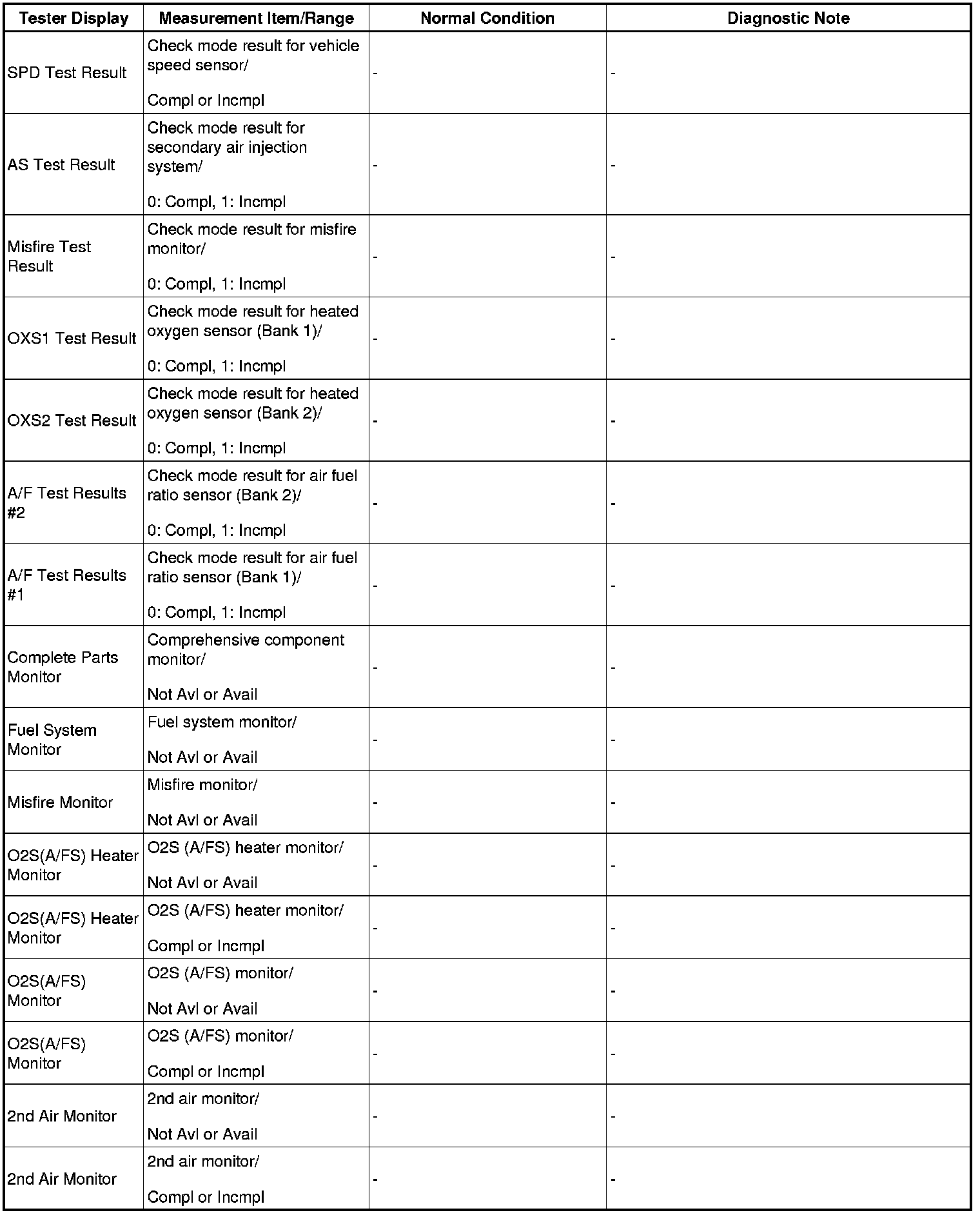 (e) Perform the System Check by referring to the table below.