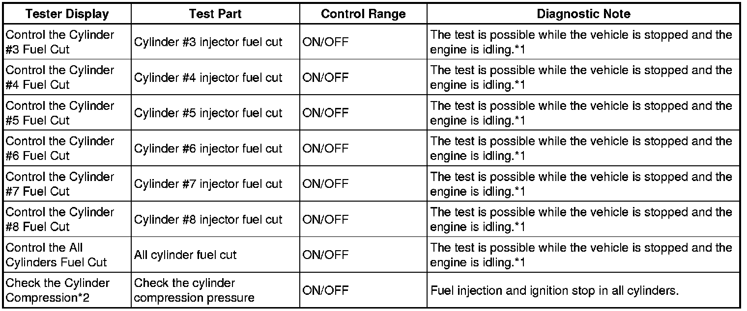 In this Active Test, the fuel and ignition of all cylinders is cut, and cranking occurs for approximately 10 seconds. Then, each cylinder measures the engine speed. If a cylinder engine speed is higher than the other, that cylinder compression pressure is compared to the other, and whether or not the compression pressure is low can be determined.