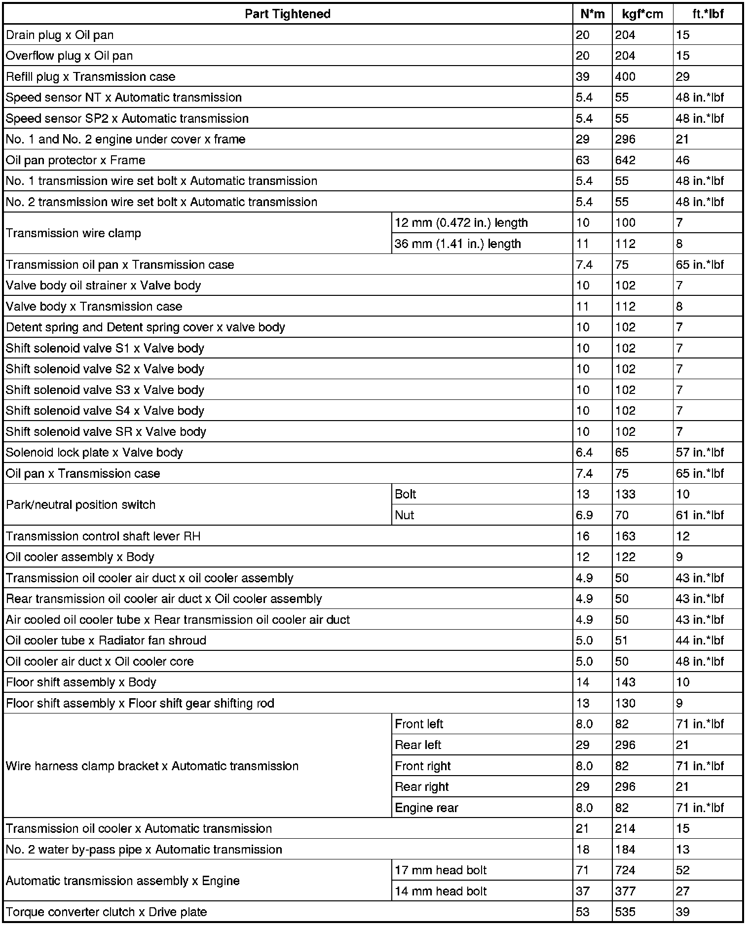 SPECIFICATIONS: AB60F AUTOMATIC TRANSMISSION / TRANSAXLE: TORQUE SPECIFICATIONS
