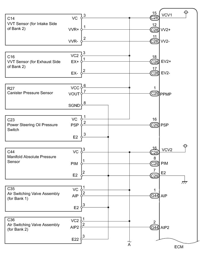 The ECM constantly generates a 5 V power source voltage from the battery voltage supplied to the +B (BATT) terminal to operate the microprocessor. The ECM also provides this power source voltage to the sensors through the VC output circuit.