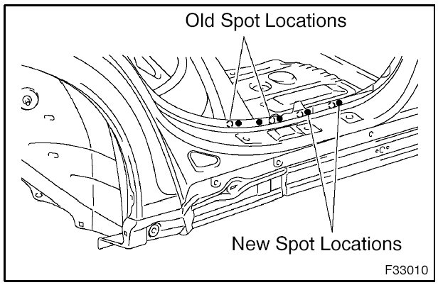 NOTICE: Inspect the welds after spot welding. For points with insufficient weld strength join the panels using plug welds.