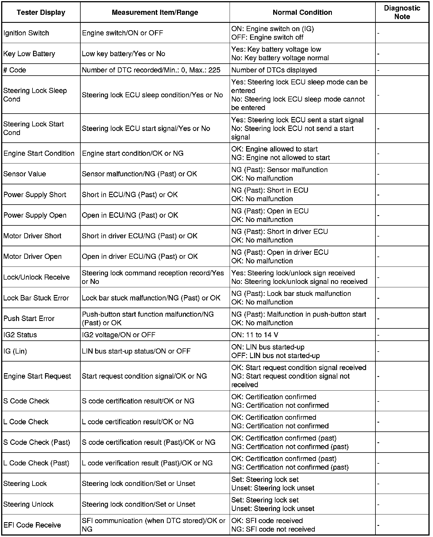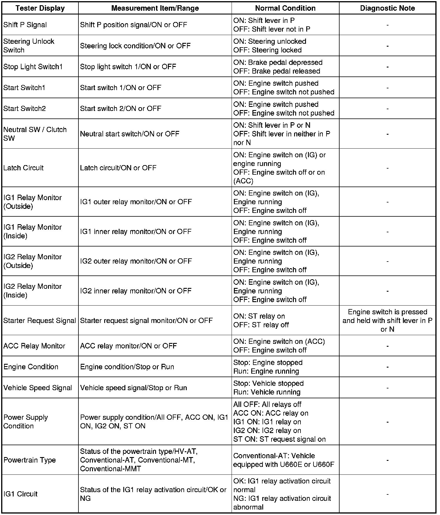 Using the Techstream to read the Data List allows the values or states of switches, sensors, actuators and other items to be read without removing any parts. This non-intrusive inspection can be very useful because intermittent conditions or signals may be discovered before parts or wiring is disturbed. Reading the Data List information early in troubleshooting is one way to save diagnostic time.