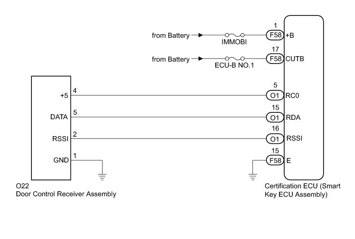 When the entry door lock and unlock functions and wireless door lock and unlock functions do not operate, radio wave interference, or a malfunction in the key or signal circuit between the door control receiver assembly and certification ECU (smart key ECU assembly) is suspected. The signal circuit is shared by the entry function and wireless door lock function.