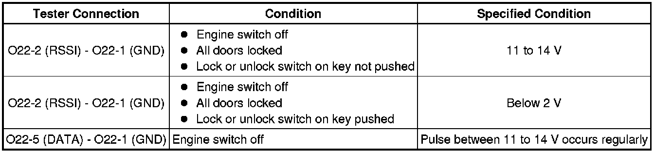 When measuring the battery voltage, while operating the lock switch of a door outside handle assembly, bring the key within the entry operating range to perform the measurement. For the entry operating range, refer to System Description System Description.