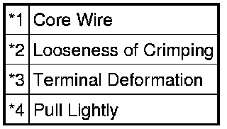 (2) Checking when a connector is disconnected: Check by pulling the wire harness lightly from the backside of the connector. Look for unlatched terminals, missing terminals, loose crimps or broken conductor wires. Visually check for corrosion, metallic or foreign matter and water, and bent, rusted, overheated, contaminated or deformed terminals.