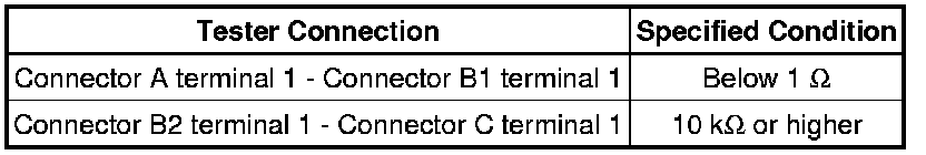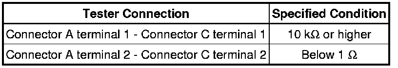 * If the results match the values specified above, an open circuit exists between terminal 1 of connector A and terminal 1 of connector C.