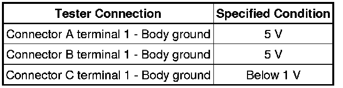 With each connector still connected, measure the voltage between body ground and the following terminals (in this order): 1) terminal 1 of connector A, 2) terminal 1 of connector B, and 3) terminal 1 of connector C.
