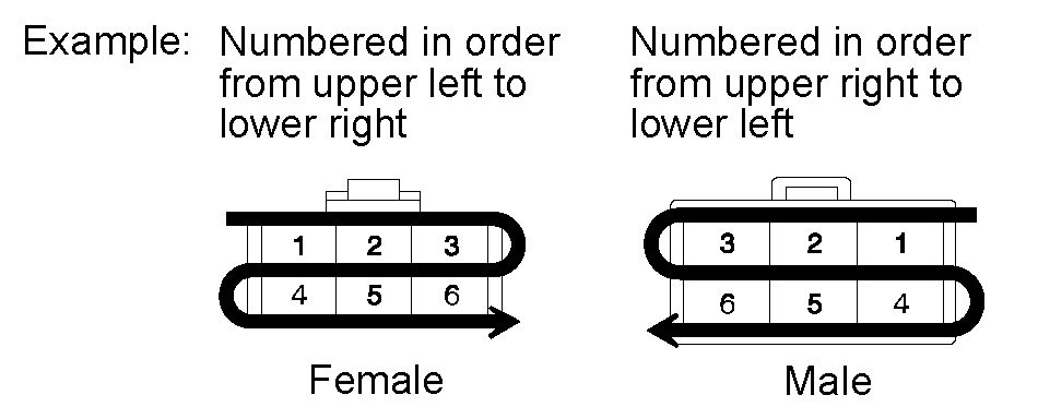 Symbol (Down Arrows) indicates the male terminal connector. Numbers outside connector codes indicate the pin numbers of both male and female connectors.