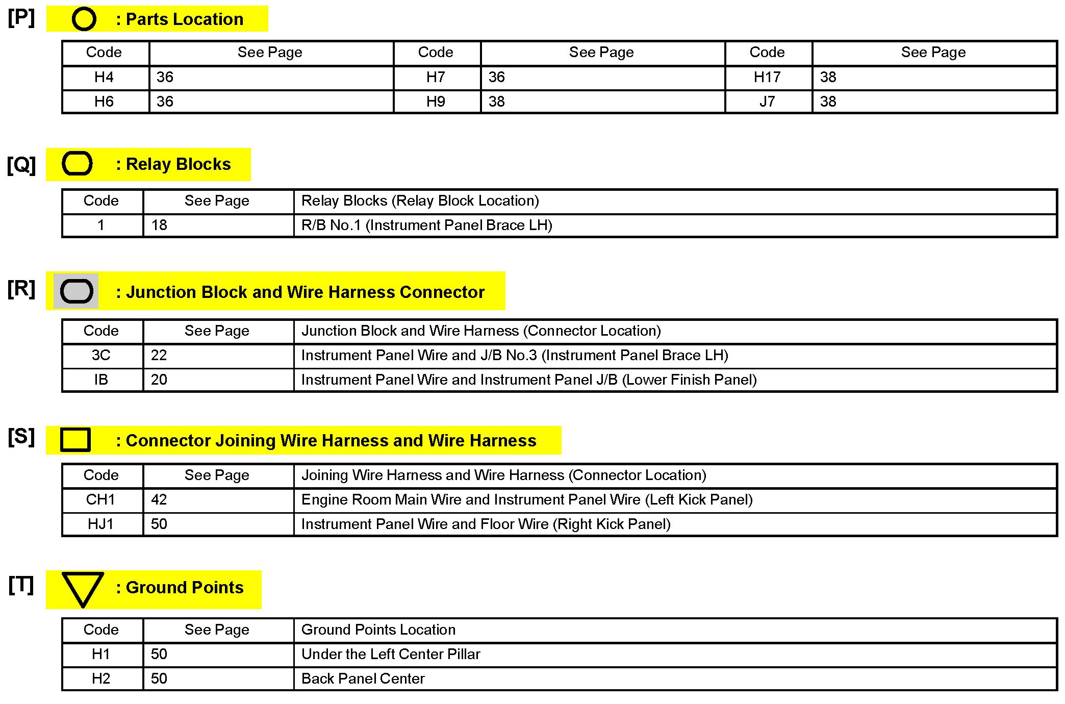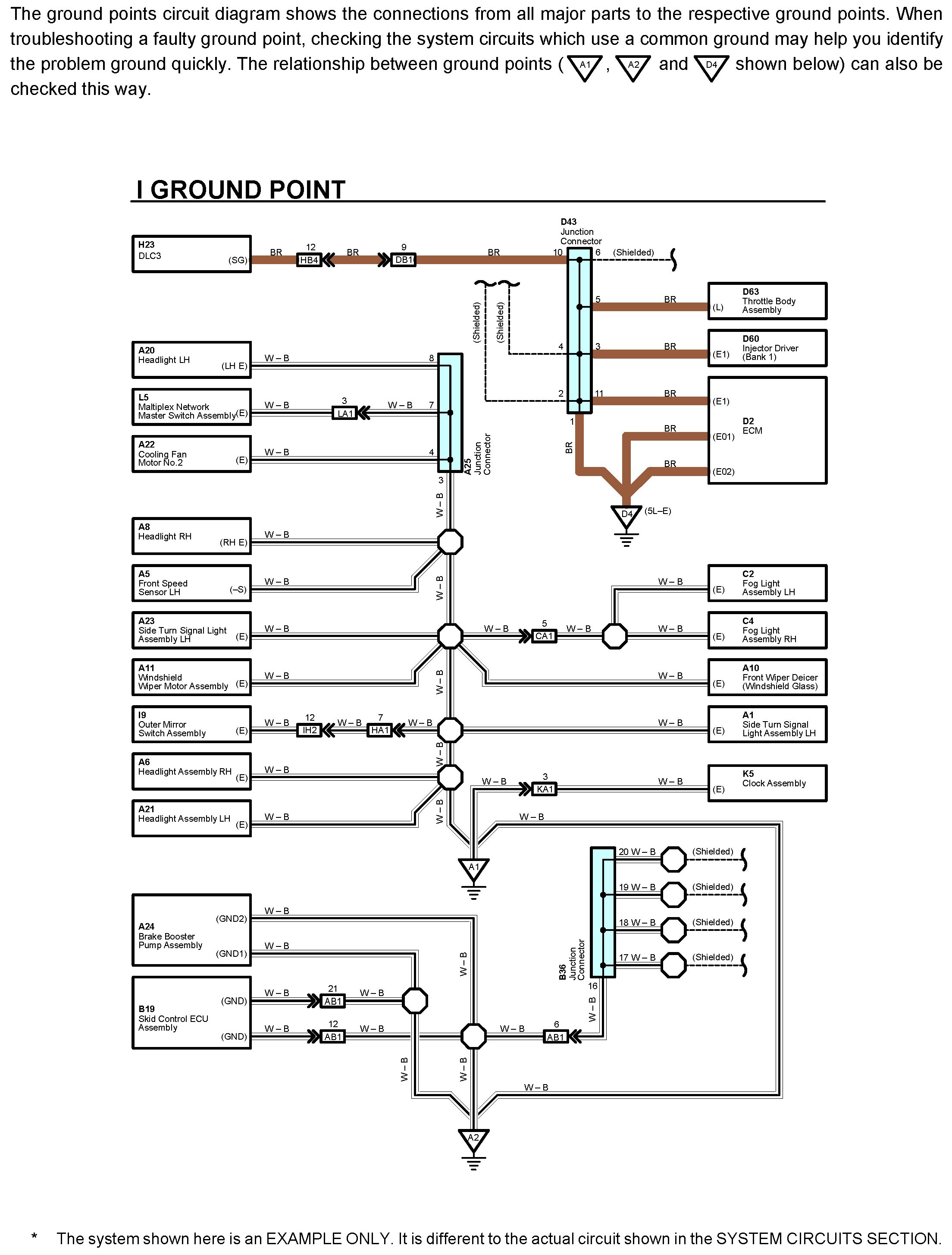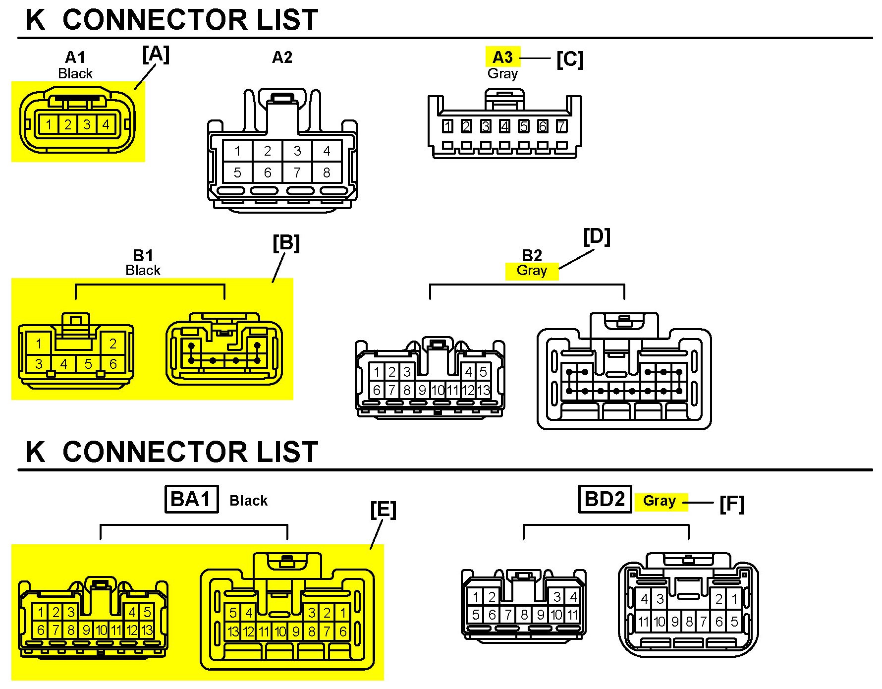 [K] : Indicates the ground point. The code consists of the two characters: A letter and number. The first character of the code indicates the alphabetical code allocated to the wire harness. The second character indicates a serial number used to distinguish between the ground points in cases when more than one ground point exist on the same wire harness.