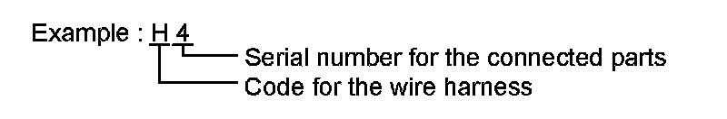 * The first character of the code indicates the alphabetical code allocated to the wire harness, and the second character indicates the serial number of the parts connected to the wire harness.