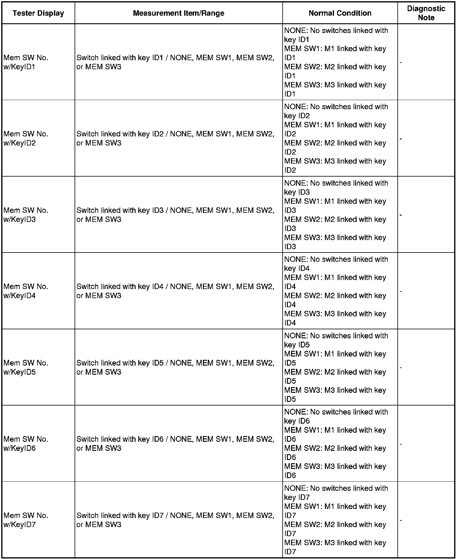 The key ID can be registered to be linked with each of the M1, M2 and M3 seat memory switches. The key ID registration procedure should be performed while the electrical key transmitter is in the vehicle, the engine switch is on (IG), and the driver door is closed. When the registration is completed, the buzzer will sound as an answerback.