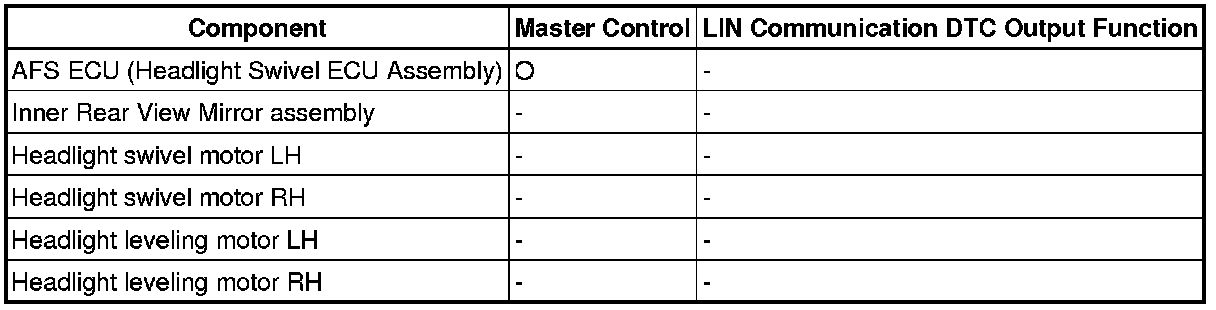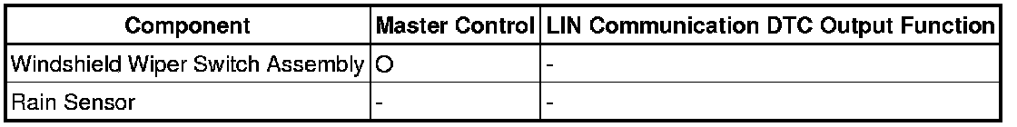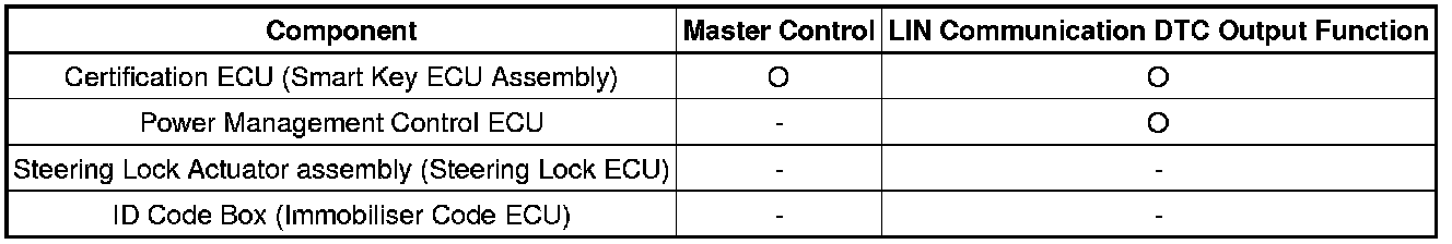 The LIN communication system is used for communication between the components in the tables below. If communication cannot be performed through LIN communication because of an open in the communication lines or other reason, the master control ECU of the relevant system will output a DTC. Refer to the table below about the communication bus lines and connected components.