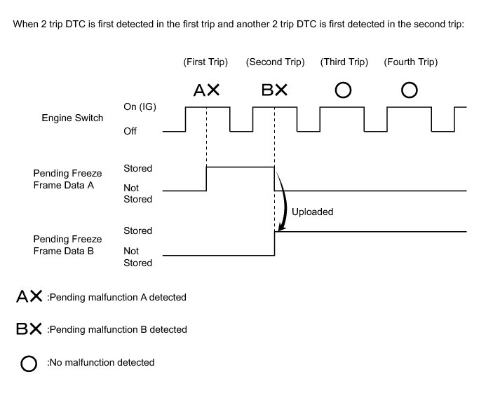 * With previous pending freeze frame data stored, if pending freeze frame data is newly stored when a 2 trip DTC is detected in the first trip, the old freeze frame data will be replaced with the new one of the newly detected DTC in the next trip.