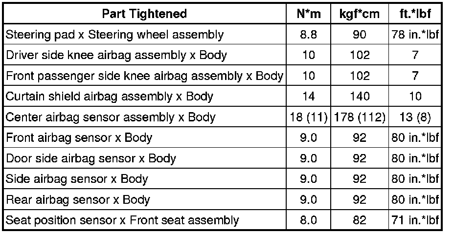 SPECIFICATIONS: SUPPLEMENTAL RESTRAINT SYSTEMS: TORQUE SPECIFICATIONS