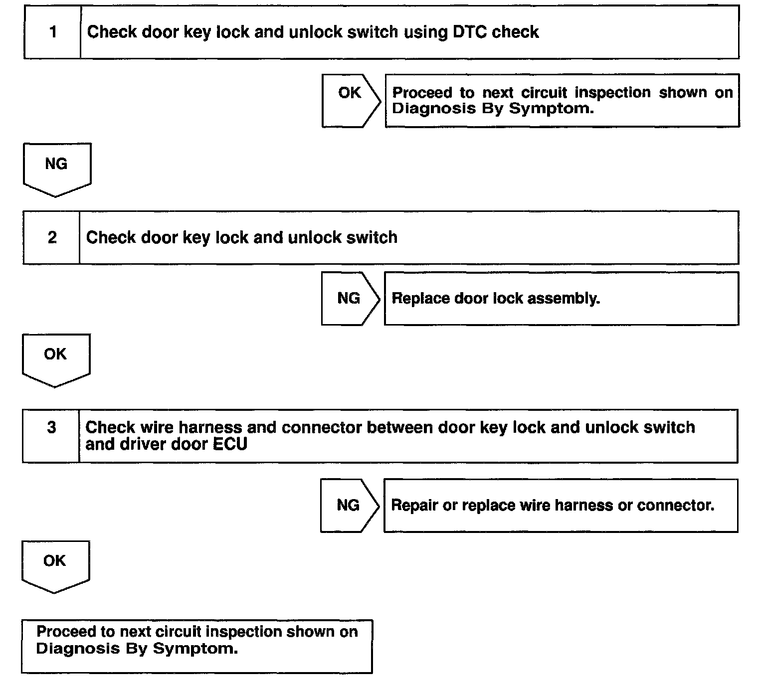 CIRCUIT DESCRIPTIONThis DTC is output when failure of the door key lock and unlock switch circuit is detected.
