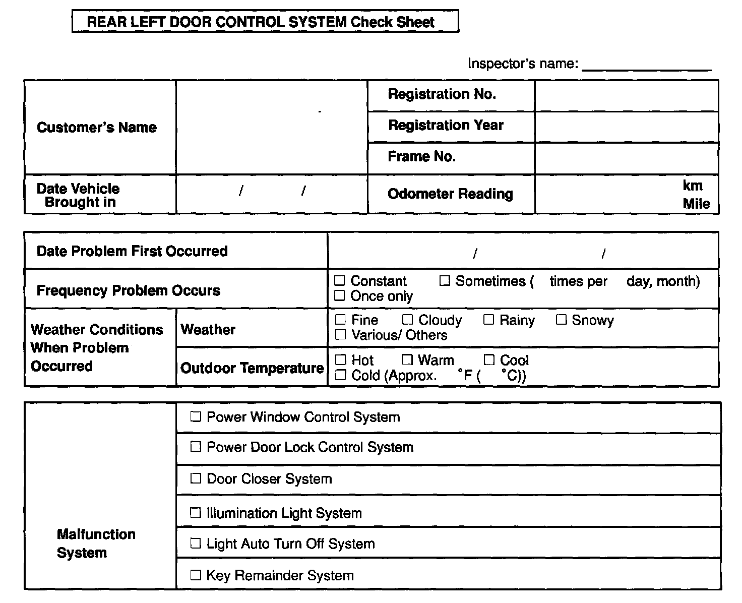 Rear Left Door Control System Check Sheet: