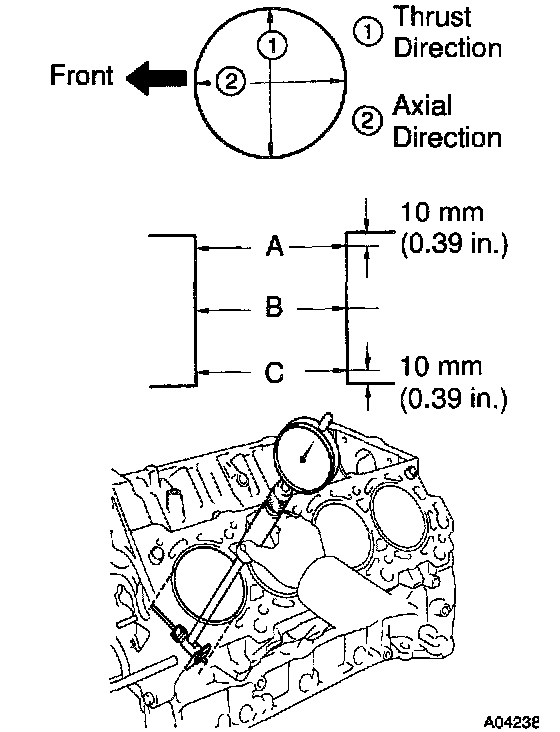 Using a cylinder gauge, measure the cylinder bore diameter at positions A, B and C in the thrust and axial directions.