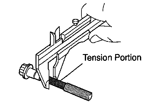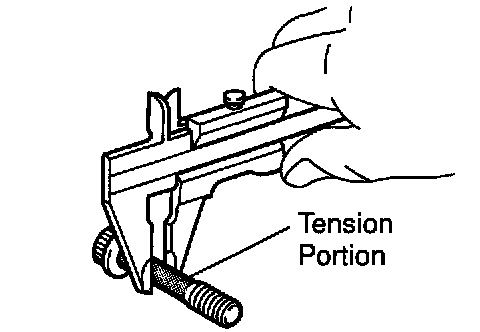 e. Using vernier calipers, measure the tension portion diameter of the main bearing cap bolt.