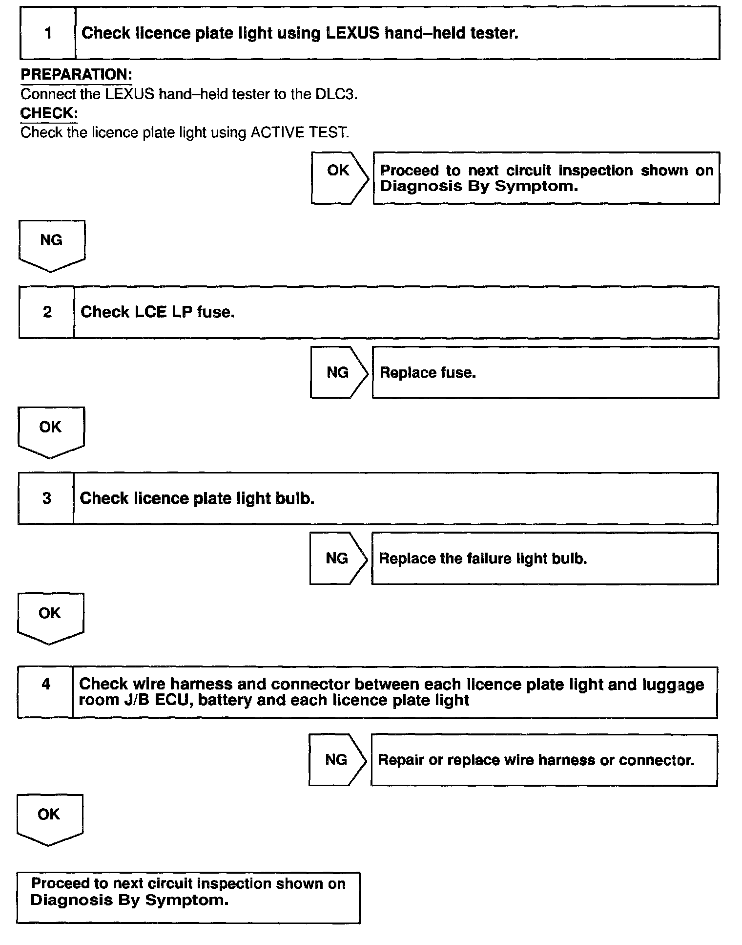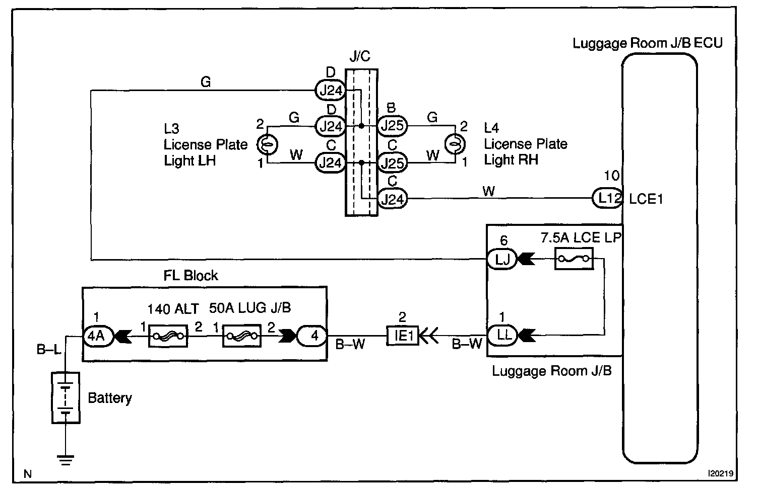 Receiving the light control switch TAIL signal from the luggage room J/B ECU makes the licence light come on.