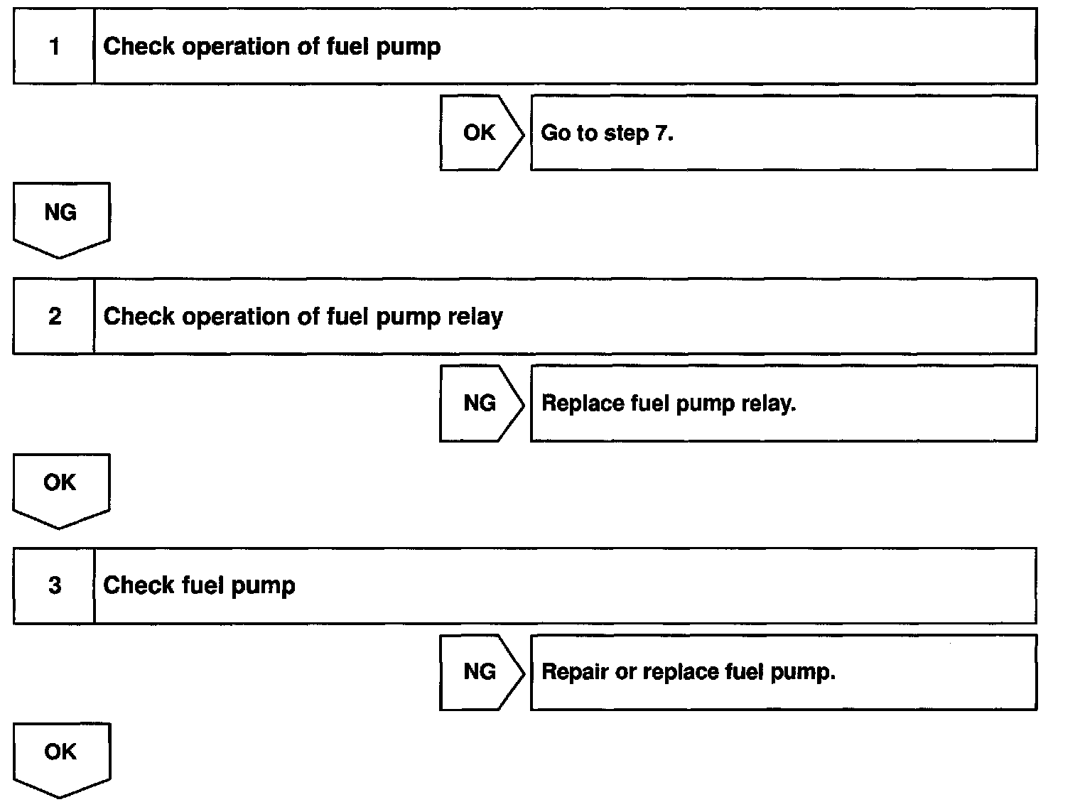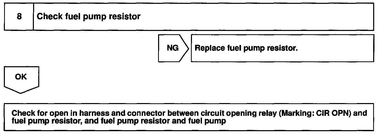 When the STA signal and NE signal are input to the ECM, Tr1 is turned ON, current flows to coil of the circuit opening relay, the relay switches on, power is supplied to the fuel pump and the fuel pump operates. While the NE signal is generated (engine running), the ECM keeps Tr1 ON (circuit opening relay ON) and the fuel pump also keeps operating.