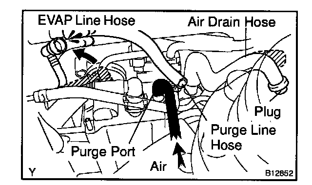 2. While holding the purge port closed, blow air (1.76 kpa, 18 gf/Sq. cm, 0.26 psi) into the EVAP port and check that air flows from the air drain port.