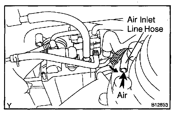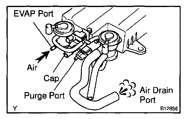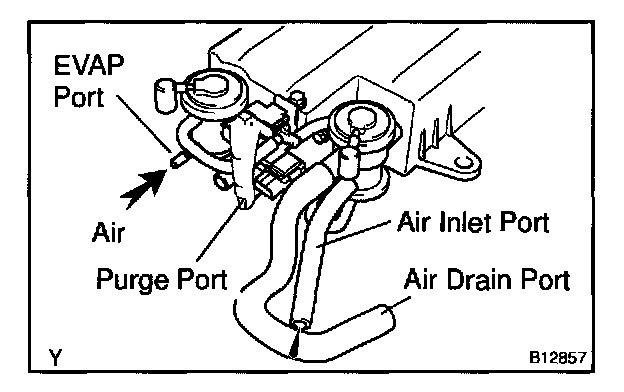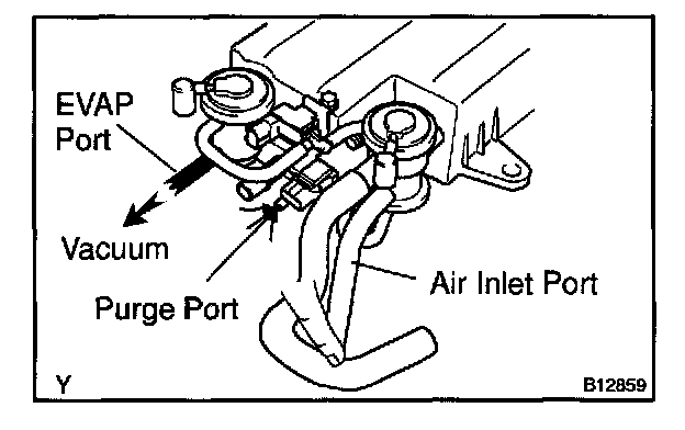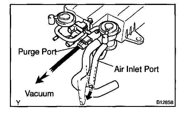 5. While holding the air inlet port closed, apply vacuum (3.43 kpa, 25.7 mmHg, 1.01 in.Hg) to the EVAP port and check that air flows into the purge port.