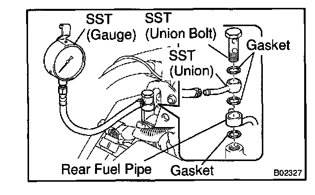 d. Install the rear fuel pipe and SST (pressure gauge) to the delivery pipe with 3 lower gaskets and SST (union bolt).