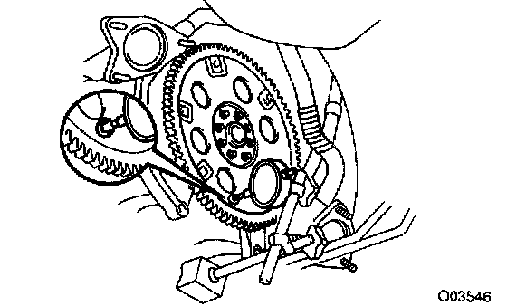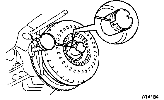 a. Temporarily mount the torque converter clutch to the drive plate. Set up a dial indictor.