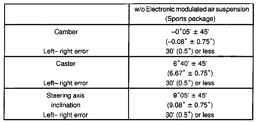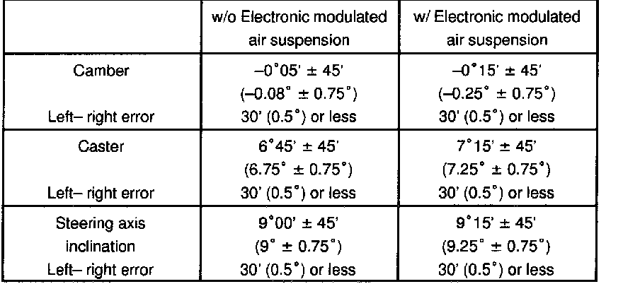 If the steering axis inclination is not as specified, after camber and caster have correctly adjusted, recheck the steering knuckle and front wheel for bearing or looseness.
