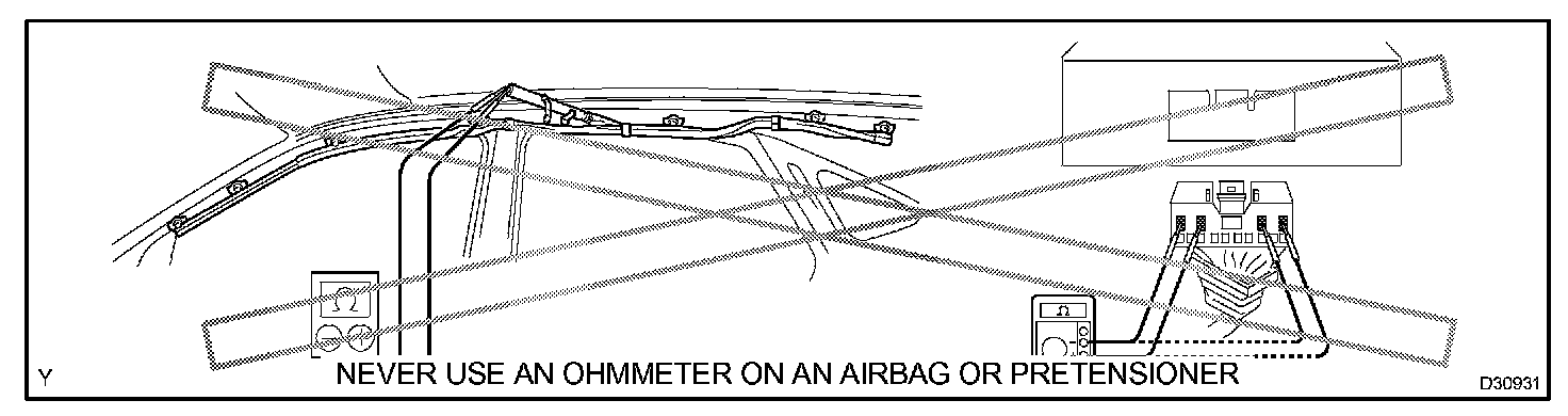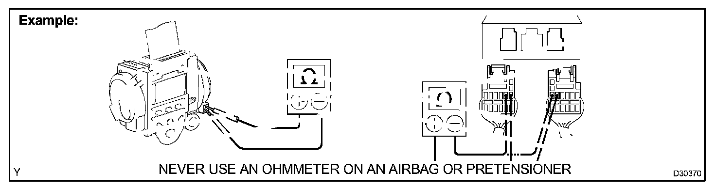 2. Never measure the resistance of the airbag squib. This may cause the airbag to inflate, which could cause serious injury.