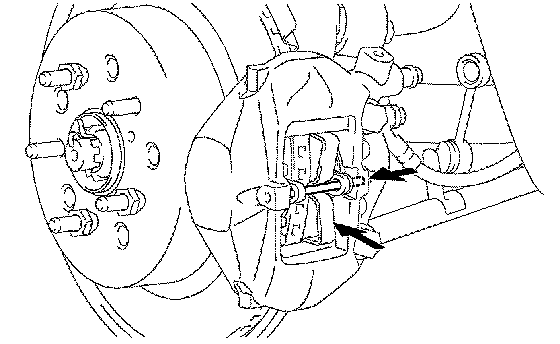 NOTICE: Since the bolted portion is an aluminum knuckle, keep it clean and avoid over tightening. Pull the disc brake cylinder assembly toward the outside of the vehicle to remove any play between the pin and knuckle hole. From this position tighten bolt 1 and then 2. Always follow these directions when installing.