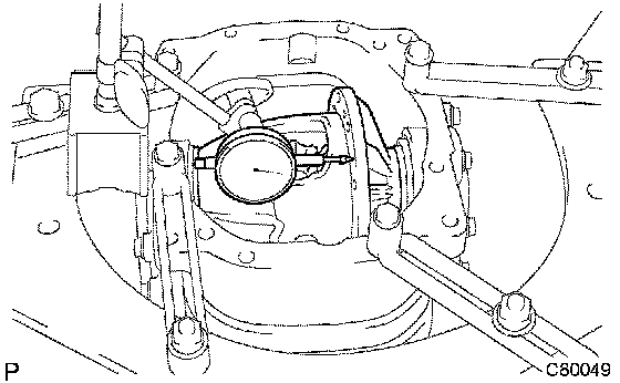 f. Place a dial indicator on the differential case flange surface at a right angle.