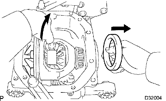 a. Raise the ring gear side of the differential case slightly to remove the drive pinion side outer race.