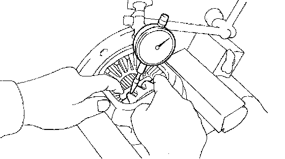 b. Place a dial indicator on the tip of the pinion gear tooth at a right angle. Hold the side gear in the differential case and check that the backlash is 0 mm (0 inch).