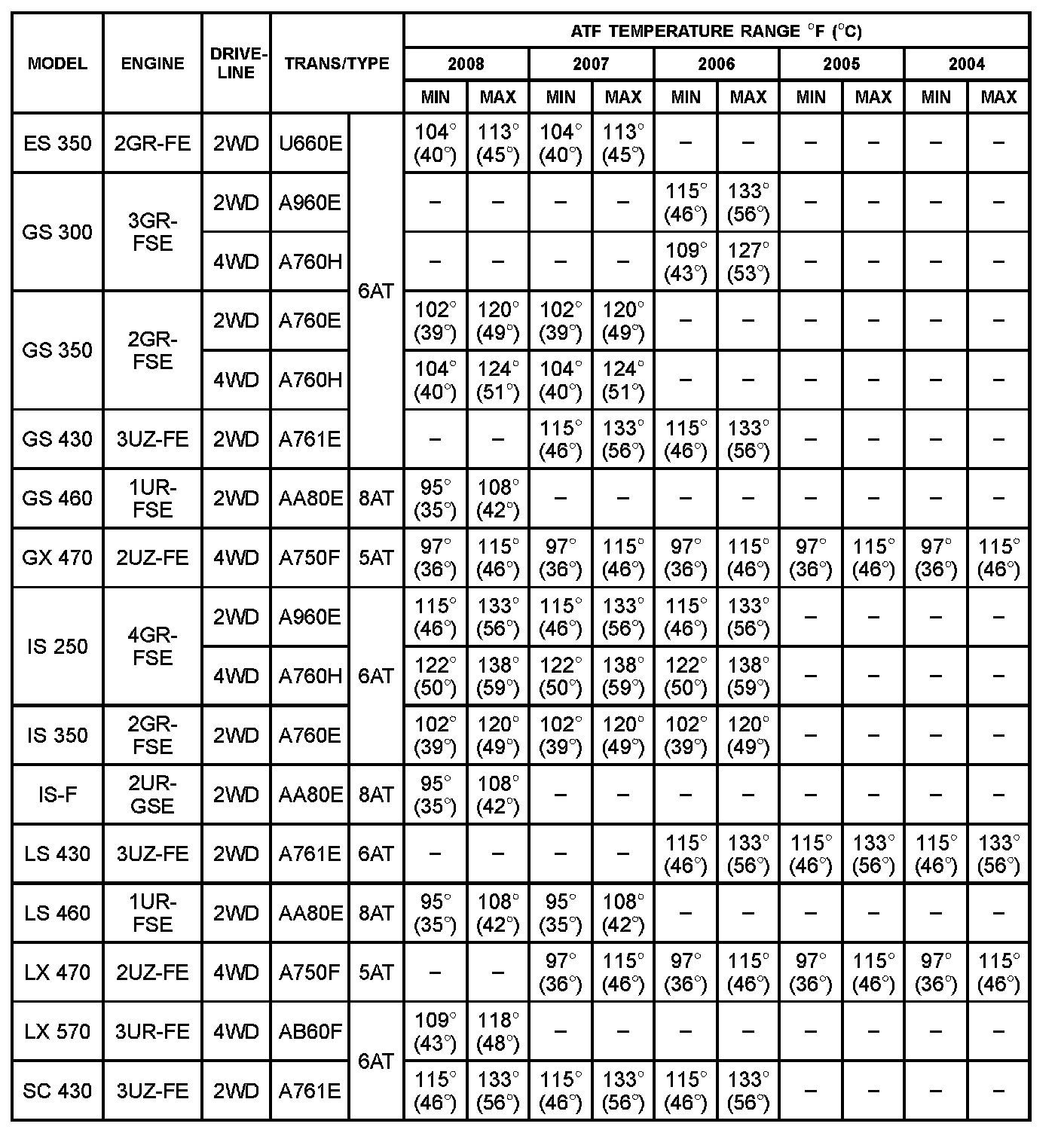 ATF Level Inspection Temperature Range Table