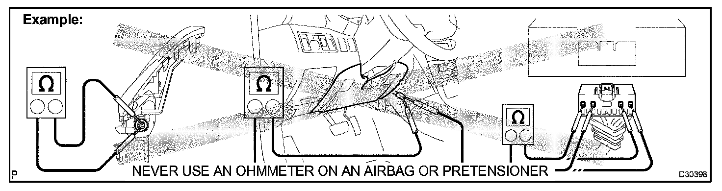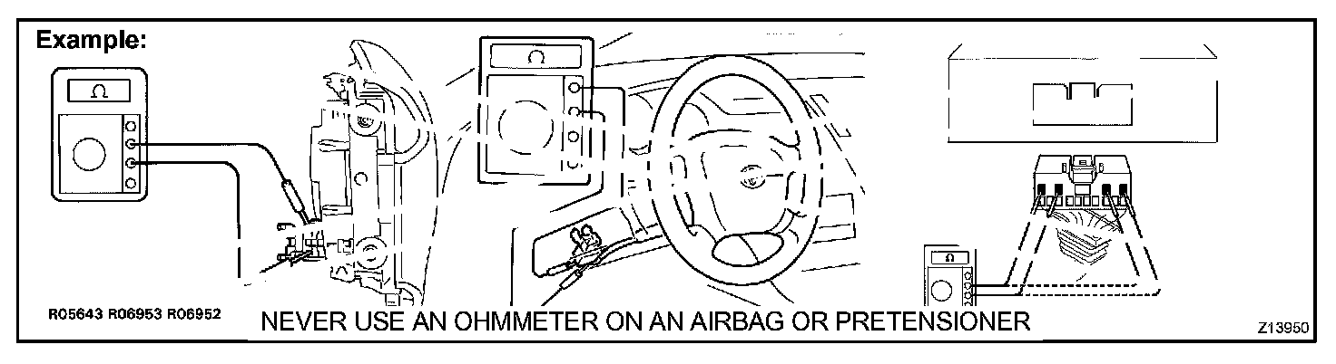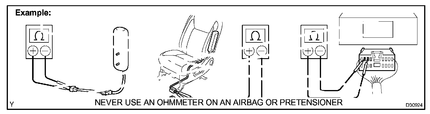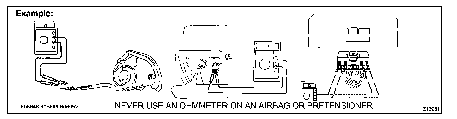 2. Never measure the resistance of the airbag squib. This may cause the airbag to inflate, which could cause serious injury.