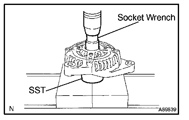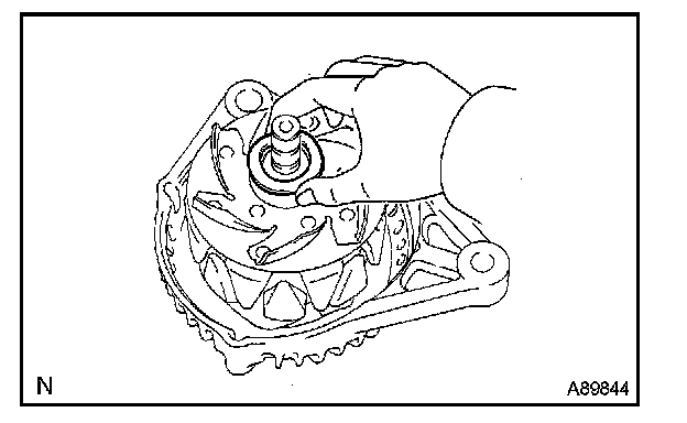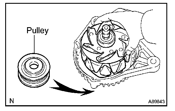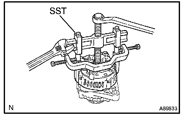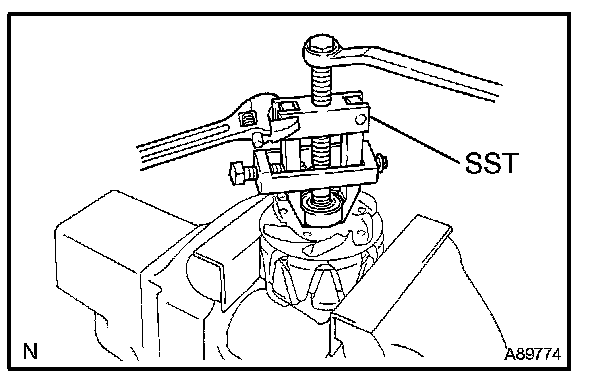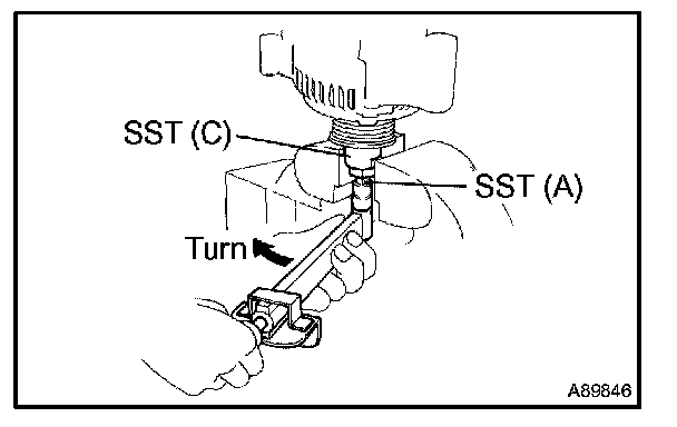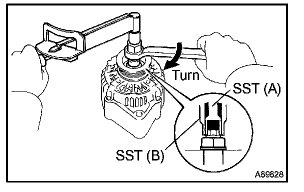e. To loosen the pulley nut, turn SST (A) in the direction shown in the illustration.