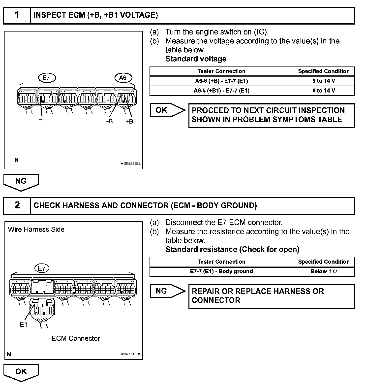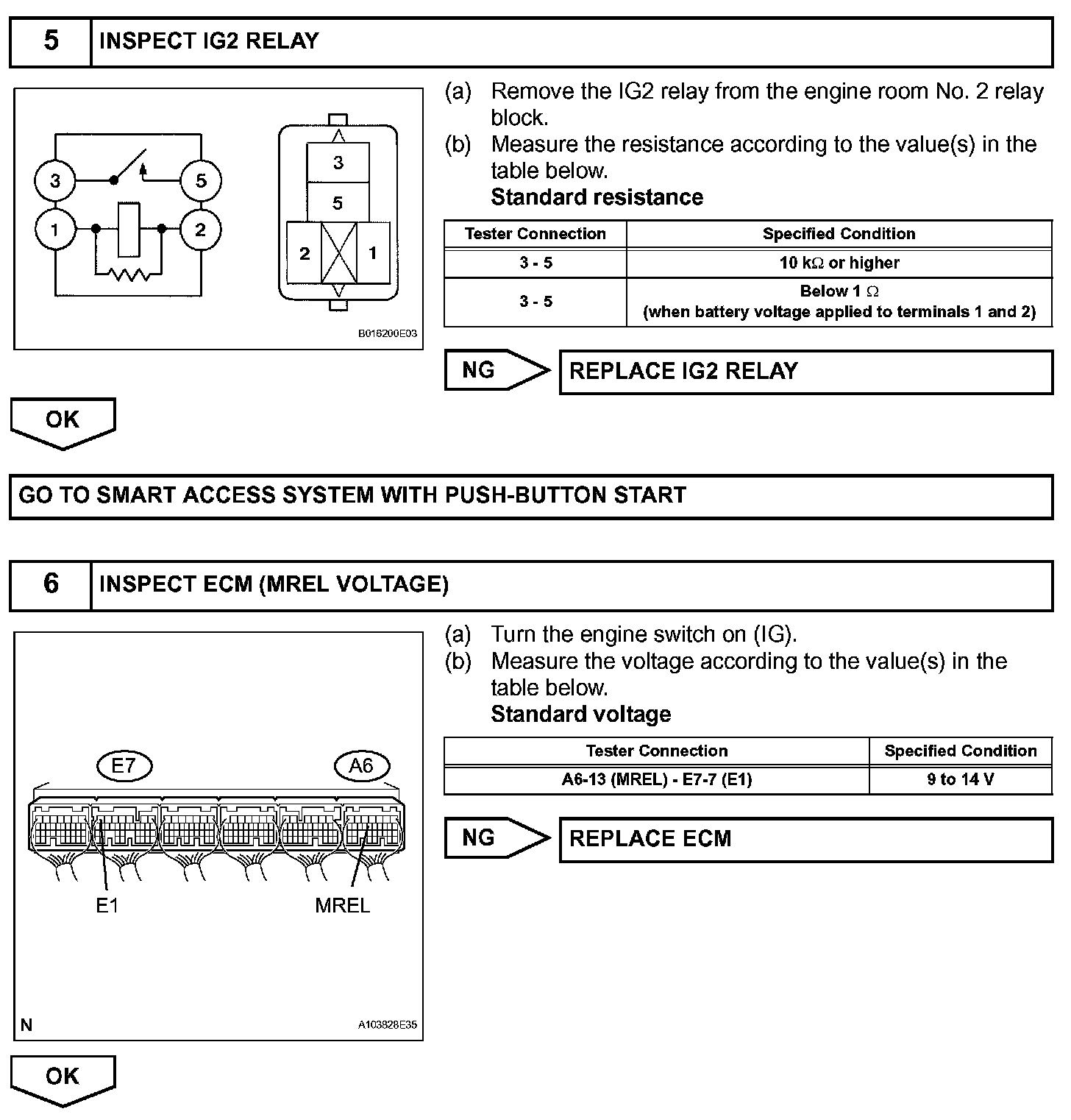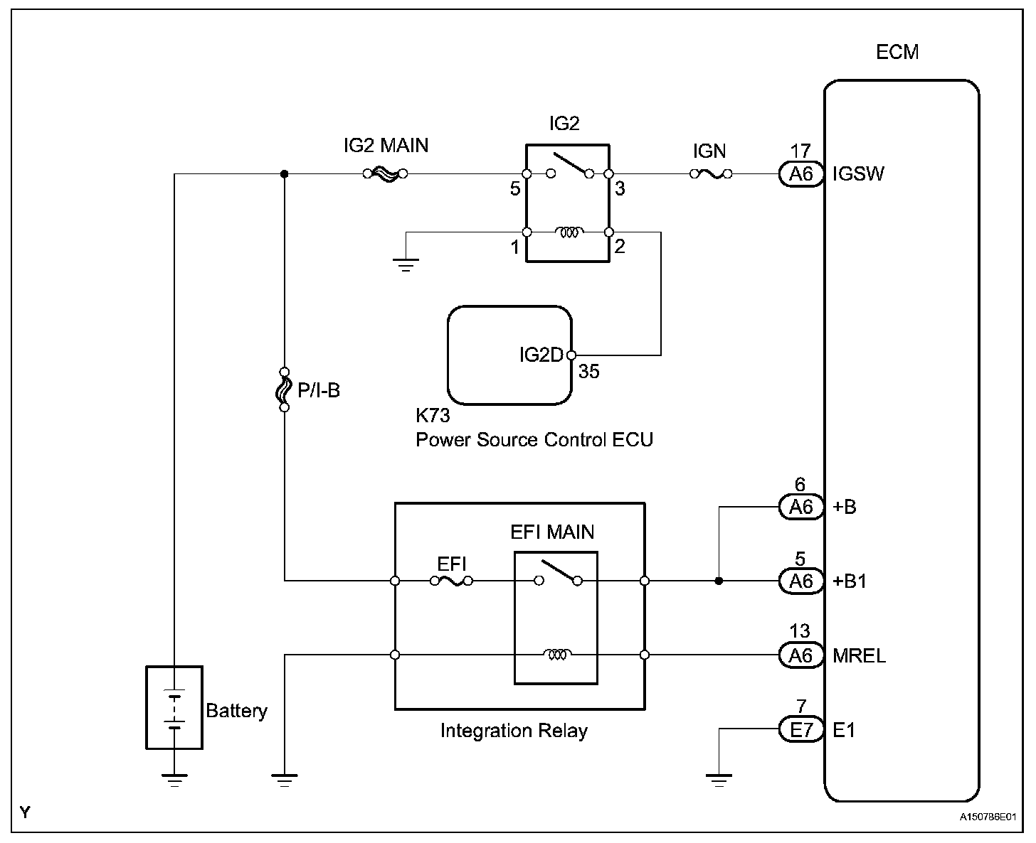 When the engine switch is turned on (IG), voltage from the ECM's MREL terminal is applied to the integration relay (EFI MAIN relay). This causes the contacts of the integration relay (EFI MAIN relay) to close, which supplies power to terminal +B or +B1 of the ECM.
