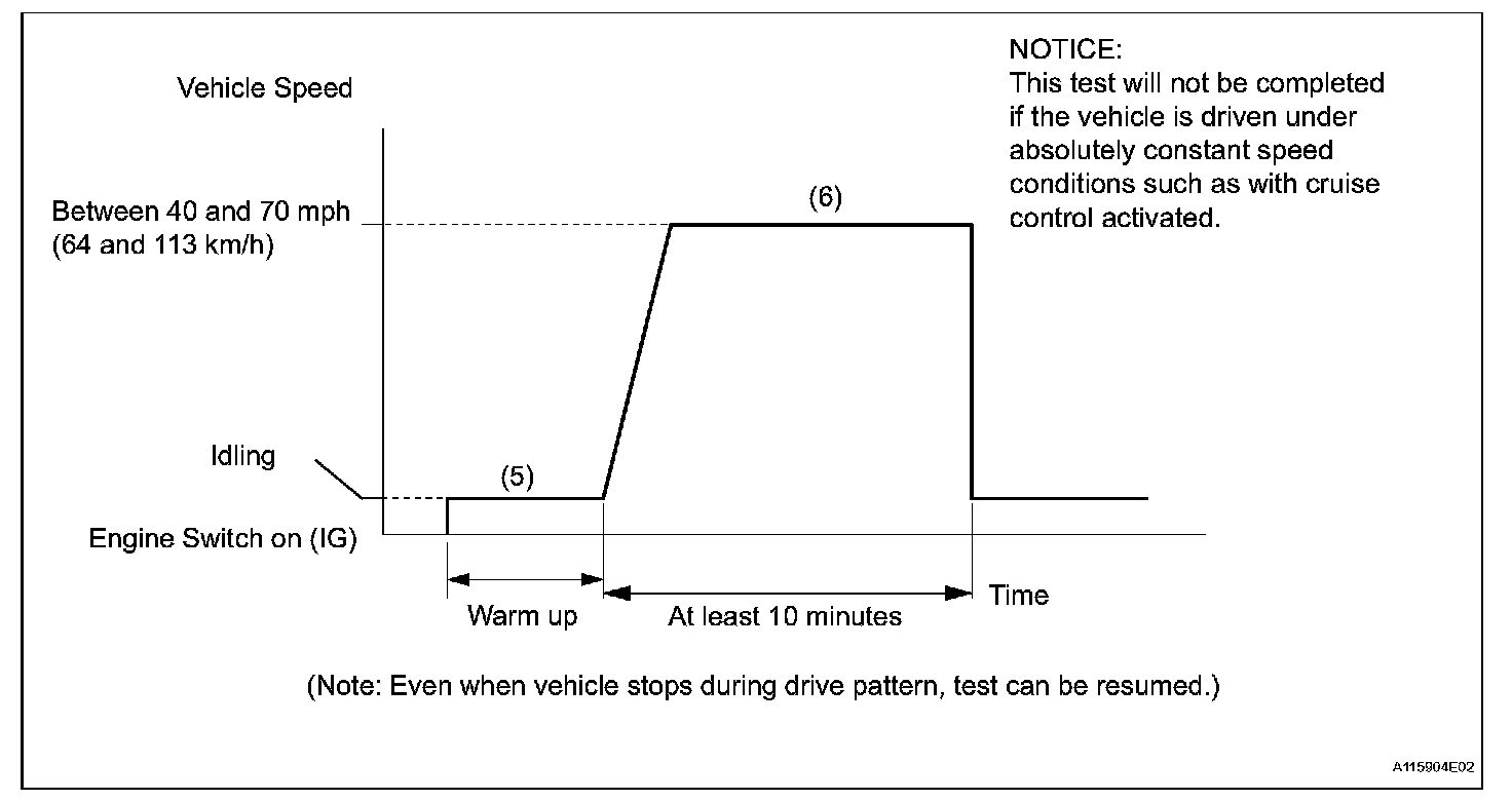 NOTE: These drive patterns represent the fastest method of satisfying all conditions necessary to achieve complete status for each specific Readiness Monitor. In the event of a drive pattern being interrupted (possibly due to factors such as traffic conditions), the drive pattern can be resumed. In most cases, the Readiness Monitor will still achieve complete status upon completion of the drive pattern. To ensure completion of the Readiness Monitors, avoid sudden changes in vehicle load and speed (driving up and down hills and/or sudden acceleration).