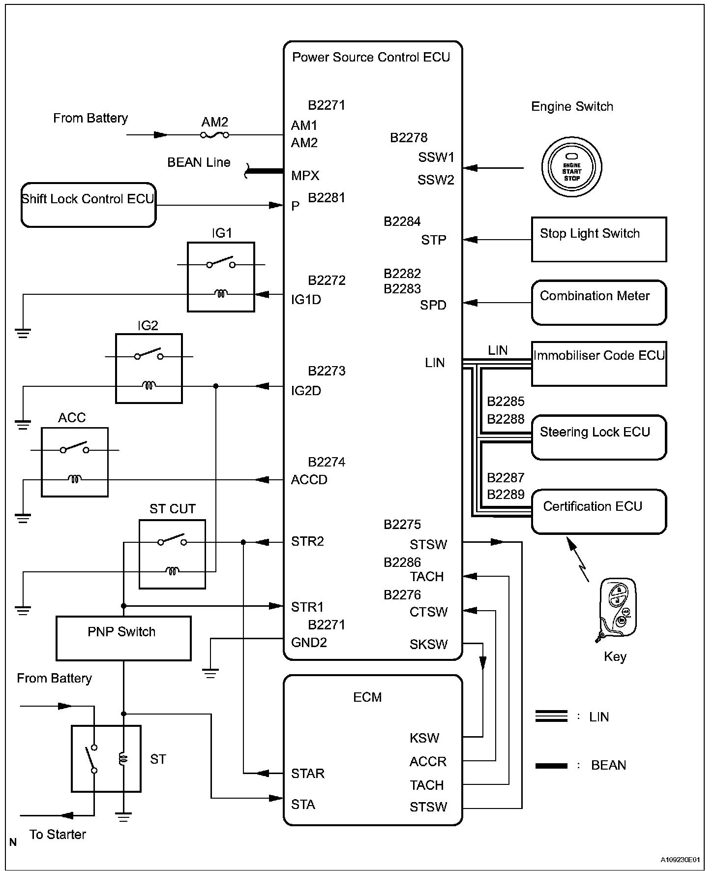 b. The power source control ECU transmits a key verification request signal from the stop light switch to the certification ECU.