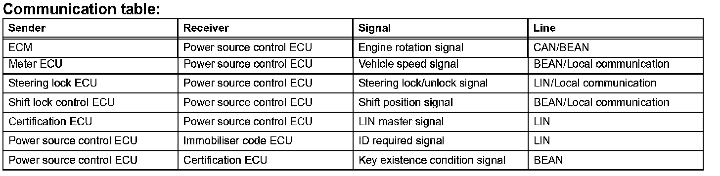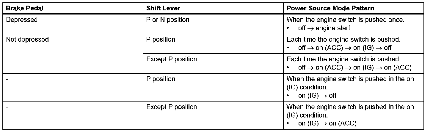 a. The push-button start uses a push-type engine switch, which the driver can operate by merely carrying the key. This system consists primarily of the power source control ECU, engine switch, ID code box, steering lock ECU, key, ACC relay, IG1 relay, IG2 relay and certification ECU. The power source control ECU controls the system. This function operates in cooperation with the smart access system. The table given shows the transition of the engine switch, which depends on whether the brake pedal is depressed or released.