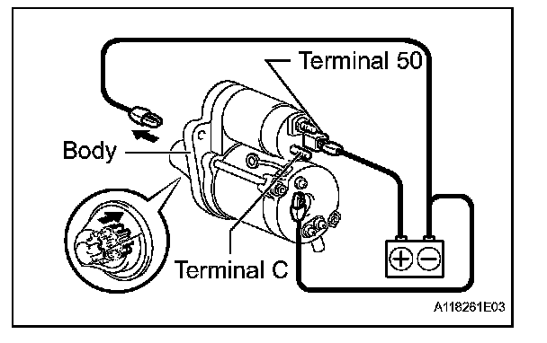4. Disconnect the negative (-) lead from the starter body. Check that the clutch pinion gear returns inward.