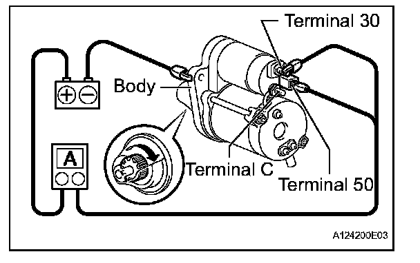 4. Check that the starter rotates smoothly and steadily while the pinion gear is moving outward. Then measure the current.