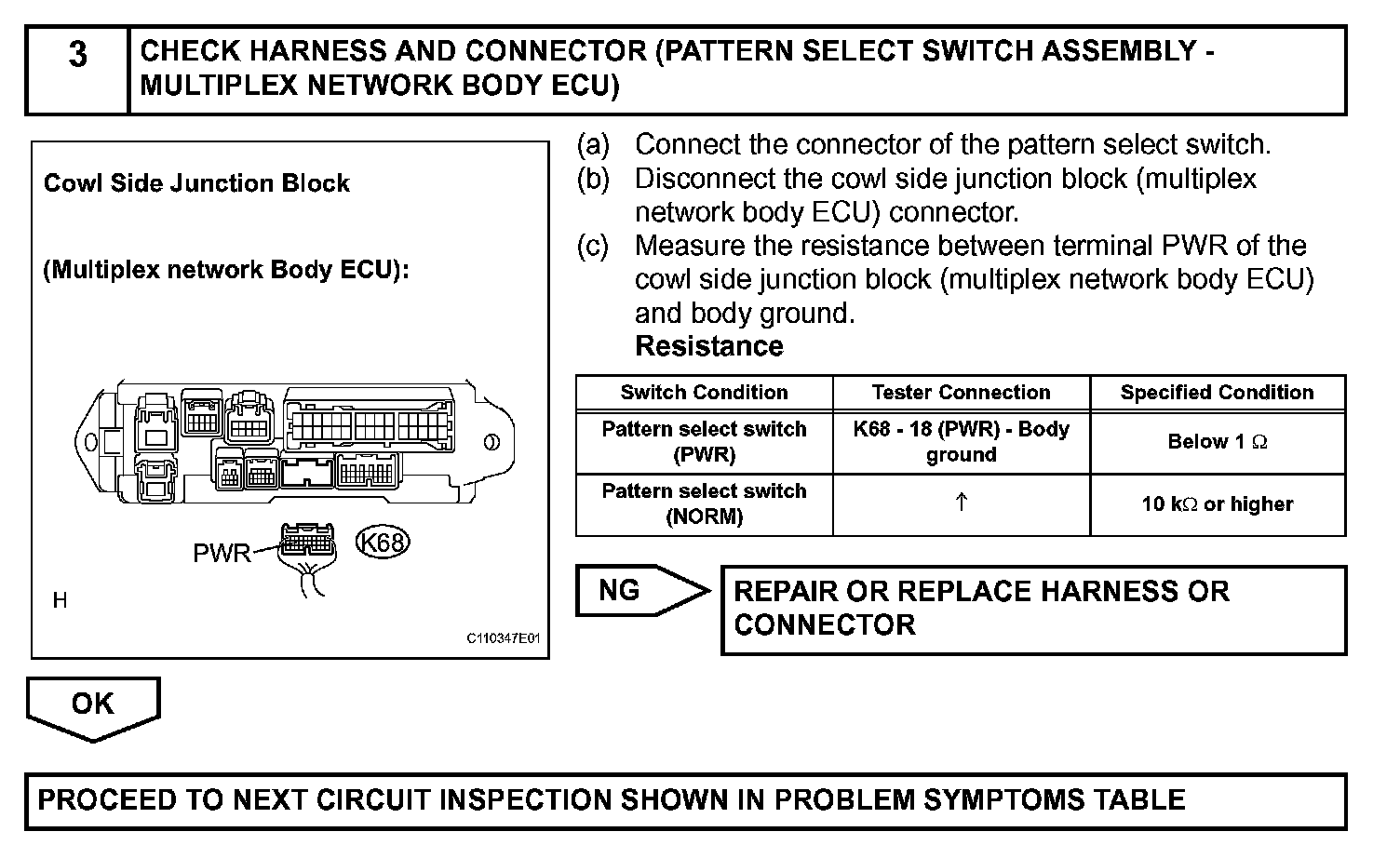 The cowl side J/B ECU receives pattern select switch information, and sends it through the multiplex communication system and CAN system to the ECM.