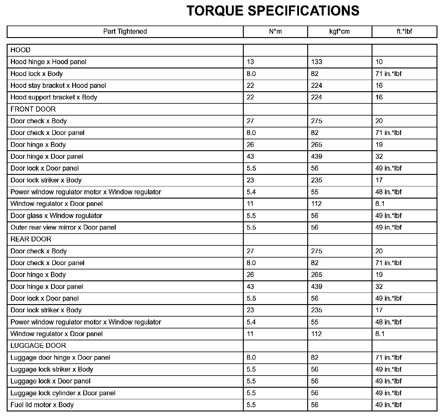 Engine Hood / Door - Torque Specifications:
