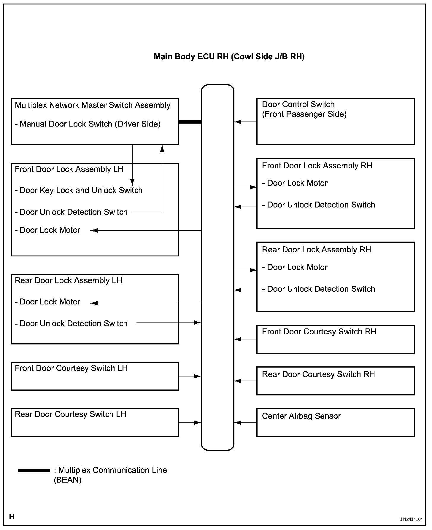 The master switch and the door control switch on the passenger door send "lock/unlock" request signals to the main body ECU RH. Then, the main body ECU RH sends these request signals to the lock motors in each door to lock/unlock all the doors at once in response to the inputs. (The BEAN is used when the master switch sends request signals to the main body ECU RH.)