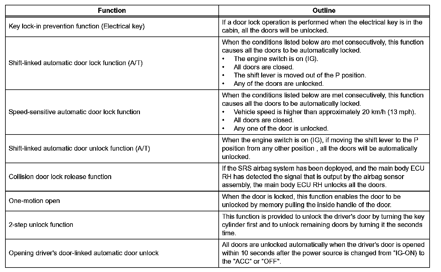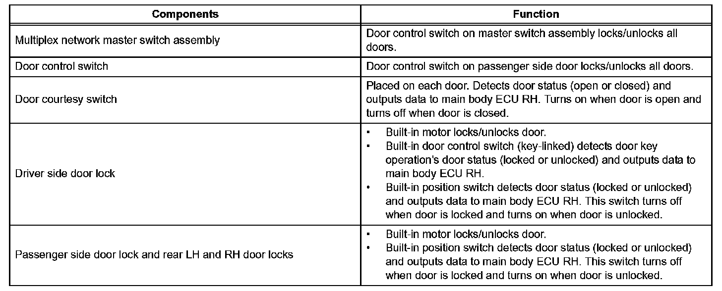 Operating the driver's door lock using a mechanical key sends request signals to lock/unlock the doors to the main body ECU RH via the master switch. "2- step unlock function" is optional for unlocking procedures of the key-linked lock for the driver side door.